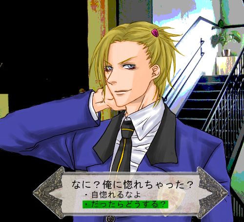 こういうタイプは自分の顔のよさを自覚している性質の悪いアレなので(ついでに軽いといい)、惚れたと言えば「ああ、そう」みたいに流されます。でも自惚れるなとか言うと物凄くプライド的なアレがアレなので、今後の展開的には「自惚れるな」を選択するとこいつのルートに流れるとかそう言うアレだよ。とか言っておきました(適当)