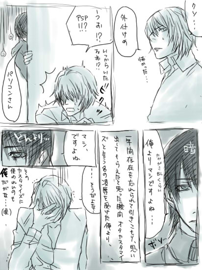 前に家電製品擬人化にはまったときについぞやらなかったパソと外付けHDとPSPです。因みにパソが受けで<どうでもいい!